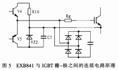 圖5所示為EXB841與IGBT柵-射極之間的連接電路原理圖。當驅(qū)動電路中的V4導(dǎo)通時,IGBT處于正常導(dǎo)通狀態(tài),當V5導(dǎo)通時,IGBT柵-射極之間通過穩(wěn)壓管VZ2提供一個-5V電壓加在其兩端,使IGBT關(guān)斷,此時V5處于臨界導(dǎo)通狀態(tài),穩(wěn)壓管VZ2處于反向偏置狀態(tài)。但由于集-柵極之間分布電容的影響,集-柵極之間的du/dt增大時,其通過分布電容形成的電流經(jīng)過,所以,要克服集-柵極之間的du/dt,確保穩(wěn)壓管不過壓,避免IGBT誤導(dǎo)通??朔u/dt的方法有二種:一是驅(qū)動電路輸出與IGBT柵-射極之間的連線采用雙絞屏蔽電纜,屏蔽層接地,二是采用快速吸收電路吸收過電壓。