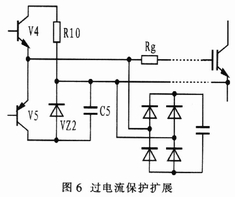 在實際應(yīng)用中,僅靠EXB841的6引腳檢測IG-BT集電極電壓來實現(xiàn)過流保護并不足以有效地保護IGBT,因此有必要在主電路中加接霍爾電流傳感器來檢測電路中的過流,如圖6所示。過流發(fā)生后,檢測電路檢測到電流,延時8μs后信號還存在的話。封鎖驅(qū)動信號以關(guān)斷IGBT。在圖中,霍爾電流傳感器如果在主電路中檢測到過流信號,其中的PNP三極管將導(dǎo)通,同時,NPN三極管被截止,EXB841的6腳被懸空;當沒有過流信號時,PNP三極管不導(dǎo)通,NPN三極管導(dǎo)通,此時電路等效于擴展前的電路。