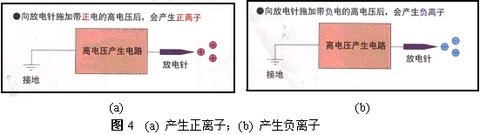⑵ 電暈放電是指:2個導(dǎo)體之間產(chǎn)生局部高電壓時,因空氣絕緣遭到破壞而產(chǎn)生的伴有藍(lán)紫色輝光的放電現(xiàn)象。電暈放電式除靜電器會對放電針施加高電壓,從而引起電暈放電。由于電暈放電的緣故,放電針附近的空氣發(fā)生電離,產(chǎn)生帶電離子。圖4(a)所示為向放電針施加帶正電的高電壓后產(chǎn)生正離子過程。圖4(b)所示為向放電針施加帶負(fù)電的高電壓后,產(chǎn)生負(fù)離子過程。
