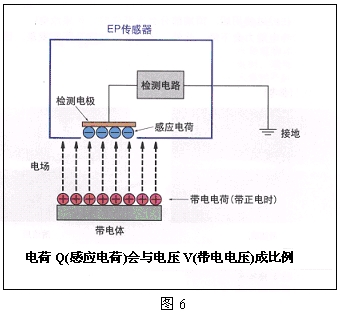靜電電位傳感器“EP傳感器”主要利用了帶電物體和檢測電極之間的靜電感應(yīng)現(xiàn)象。帶電物體的電場會致使檢測電極表面產(chǎn)生感應(yīng)電荷。該感應(yīng)電荷會被換算成帶電物體的電位并顯示出來。其基本原理見圖6。電荷Q(感應(yīng)電荷)與電壓V(帶電電壓)成比例。