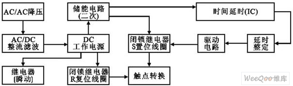 斷電延時(shí)繼電器整體構(gòu)成包括斷電延時(shí)繼電器電源部分(經(jīng)降壓、整流、濾波)以提供斷電延時(shí)繼電器內(nèi)置瞬動(dòng)電磁繼電器和2繞組閉鎖型R復(fù)位線圈工作);二次電源部分(供斷電后延時(shí)部分與2繞組閉鎖型S置位線圈工作);延時(shí)工作部分(可編程定時(shí)集成或CMOS計(jì)數(shù)分頻集成);驅(qū)動(dòng)部分;執(zhí)行繼電器部分組成(圖1)。