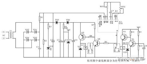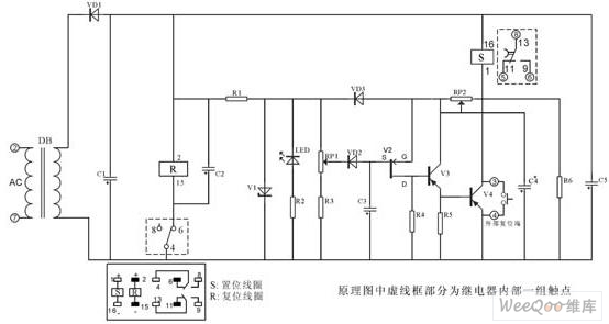 由V2P溝道場(chǎng)效應(yīng)管、V3、V4三極管以及繼電器為主要器件構(gòu)成的斷電延時(shí)型繼電器示于圖2。如下:端加入工作電源后,C1~C5都按其回路完成充電過程(充電時(shí)間應(yīng)參照產(chǎn)品規(guī)定的時(shí)間)。同時(shí)內(nèi)部2繞組閉鎖繼電器R復(fù)位線圈得電工作(虛框內(nèi)轉(zhuǎn)換觸點(diǎn)4與6由電源接通轉(zhuǎn)為斷開狀態(tài),4與8接通),相應(yīng)外部觸點(diǎn)進(jìn)行轉(zhuǎn)換端接通,呈延時(shí)工作狀態(tài))。