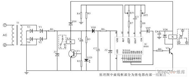 集成CD4060構(gòu)成的延時(shí)電路示于圖3。該電路核心延時(shí)由CD4060構(gòu)成,延時(shí)設(shè)定由RP1與配置的C3來設(shè)定。內(nèi)部2繞組閉鎖繼電器采用DC24V(采用較高工作電壓的繼電器,可降低其驅(qū)動(dòng)電流,使驅(qū)動(dòng)部分較為簡(jiǎn)單)。端加入工作電源,V1三極管工作,使其R復(fù)位線圈吸合工作,內(nèi)部觸點(diǎn)回至原始狀態(tài)。C2、C4完成充電工作。