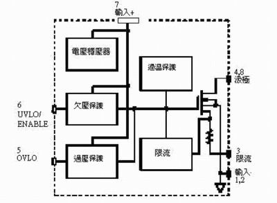 該集成器件包括用戶可選擇的欠壓和過壓保護級,以及一個可調(diào)的啟動限流,利用一個電阻就可將電流從最大值向下調(diào)。它還集成了一個內(nèi)部過熱保護電路,從而大大增加了短路和過載情況下該器件的可靠性。