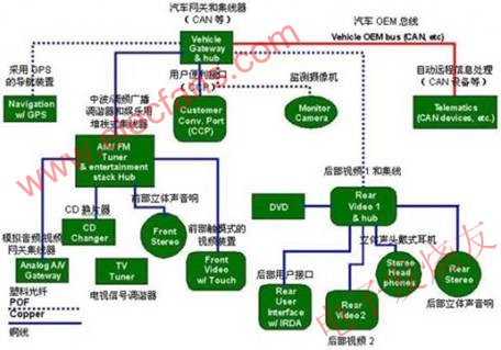 如圖所示,車載網(wǎng)絡(luò)的架構(gòu)可分為內(nèi)嵌式網(wǎng)絡(luò)和用戶便利端口(CCP)。目前的技術(shù)規(guī)格將內(nèi)嵌式塑料光纖(POF)車載網(wǎng)絡(luò)定義為與現(xiàn)有的MOST(媒體定向系統(tǒng)傳輸)技術(shù)相似的規(guī)格。但是,前者的架構(gòu)更加穩(wěn)固、能夠提供更高的數(shù)據(jù)傳輸速率,并且更易于實(shí)現(xiàn)。這個(gè)網(wǎng)絡(luò)能夠連接各種電子設(shè)備,例如DVD播放機(jī)、視頻顯示屏、導(dǎo)航系統(tǒng)、收音機(jī)接收設(shè)備、通訊設(shè)備,如無(wú)線電話或應(yīng)急自動(dòng)遠(yuǎn)程通信及信息處理技術(shù)術(shù)語(yǔ),以及其它的多媒體應(yīng)用。