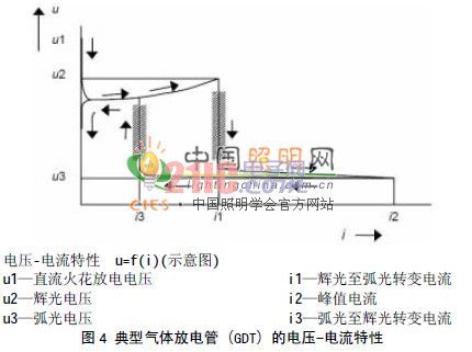 由于浪涌干擾所致,一旦加在氣體放電管兩端的電壓超過(guò)火花放電電壓(圖4的u1)時(shí),放電管內(nèi)部氣體被電離,放電管開始放電。放電管端的壓降迅速下降至輝光放電電壓(圖4的u2)(u2在表2中的數(shù)值為140V或180V,與管子本身的特性有關(guān)),管內(nèi)電流開始升高。隨著放電電流的進(jìn)一步增大,放電管便進(jìn)入弧光放電狀態(tài)。在這種狀態(tài)下,管子兩端電壓(弧光電壓)跌得很低(圖4的u3)(u3在表2中數(shù)值為15V或20V,與管子本身的特性有關(guān)),且弧光電壓在相當(dāng)寬的電流變動(dòng)范圍(從圖4的i1→i2過(guò)程中)內(nèi)保持穩(wěn)定。因此,外界的高電壓浪涌干擾,由于氣體放電管的放電作用,被化解成了低電壓和大電流的受保護(hù)情況(u3和i2),且這個(gè)電流(從圖4的i2→i3)經(jīng)由氣體放電管本身流回到干擾源里,免除了干擾對(duì)燈具可能帶來(lái)的危害。隨著浪涌過(guò)電壓的消退,流過(guò)氣體放電管的電流降到維持弧光放電狀態(tài)所需的最小值以下(約為10mA~100mA,與管子本身的特性關(guān)),弧光放電便停止,并再次通過(guò)輝光放電狀態(tài)后,結(jié)束整個(gè)放電狀態(tài)(熄弧)。