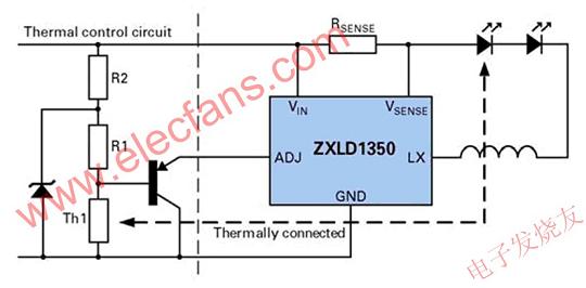 圖3顯示了一個(gè)典型的采用簡單熱控制的降壓穩(wěn)壓器例子。它的優(yōu)勢是利用了Zetex半導(dǎo)體公司ZXLD1350的ADJ引腳。通過使用一個(gè)PNP晶體管作為發(fā)射極跟隨器和使用該引腳的內(nèi)部250kΩ電阻作為負(fù)載來過驅(qū)該引腳,LED電流將與熱敏電阻成比例地下降。隨著溫度下降,熱敏電阻的阻值增加,但由于基準(zhǔn)(base)電壓增加超出了ADJ參考電壓,該晶體管就會(huì)關(guān)閉,LED僅獲得其最高設(shè)置電流,從而有效地鉗住低溫響應(yīng)。