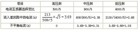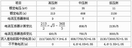 實(shí)例:一臺(tái)三相三繞組降壓變壓器,容量Se=40.5MVA,電壓110±2×2.5%kV/385±2×2.5%kV/11kV,接線(xiàn)方式:Ydd11-11,變壓器額定電流:213A/608A/2130A。主變差動(dòng)保護(hù)采用BCH-2型差動(dòng)繼電器。基本計(jì)算如表1所示,已確定110kV側(cè)為基本側(cè)。