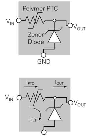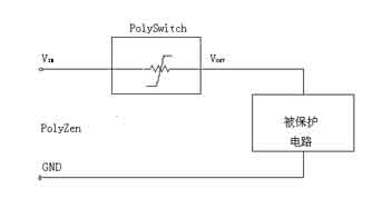 在正常工作時(shí),VIN輸入電壓高于齊納二極管的擊穿電壓VZ,有IFLT電流經(jīng)齊納二極管到地,VOUT輸出穩(wěn)定的電壓。有不正常的過(guò)壓輸入VIN 時(shí),則齊納二極管的IFLT會(huì)產(chǎn)生過(guò)流,當(dāng)器件上有過(guò)流時(shí),其電阻由低阻態(tài)瞬變到高阻態(tài),使在其上的壓降大增,VOUT輸出基本不變,而流過(guò)齊納二極管的 電流IFLT反而減小,如下圖所示。器件上電壓降的增大既保護(hù)了齊納二極管,又保護(hù)了下游的電路。另外,若被保護(hù)的下游電路中存在有局部短路或短路故障 時(shí),IOUT會(huì)增加,PPTC元件由低阻態(tài)變成高阻態(tài),可使電路得到過(guò)流保護(hù)。