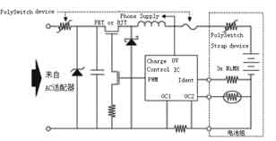 便攜式醫(yī)療電子產(chǎn)品也常常需要充電,充電的保護(hù)也可以通過(guò)PolySwitchTM元件完成。下圖就是充電器中PolySwitchTM元件的應(yīng)用。虛線框內(nèi)是電池組,PolySwitchTM元件在其中作充、放電過(guò)流保護(hù)。