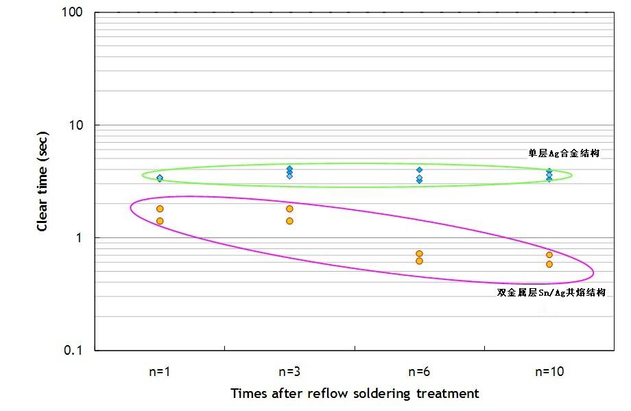 單層Ag合金結(jié)構(gòu)的保險(xiǎn)絲即使經(jīng)過多次高溫?zé)崽幚?,仍可以維持較穩(wěn)定的熔斷時(shí)間。但是雙層Sn/Ag共熔結(jié)構(gòu)的保險(xiǎn)絲,其熔斷時(shí)間有明顯變快的趨勢(shì)。