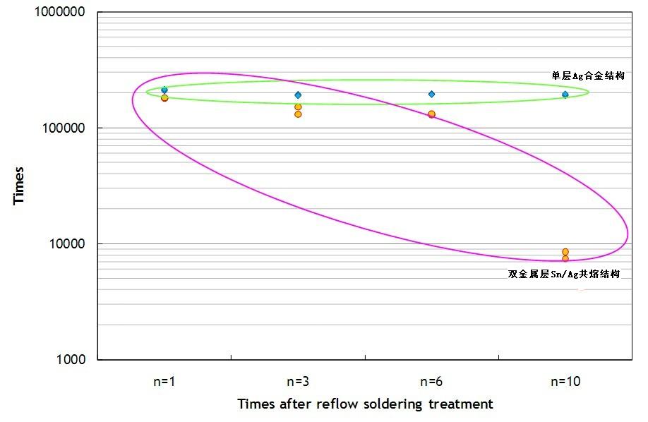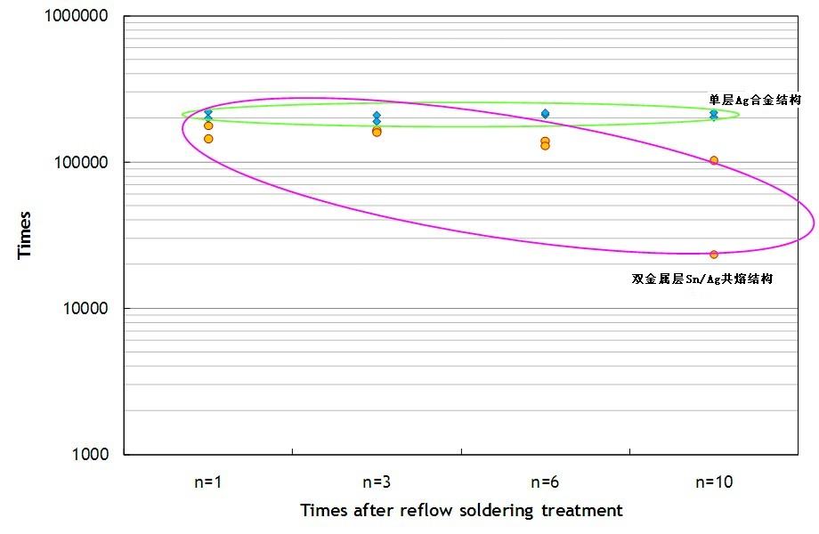 單層Ag合金結(jié)構(gòu)的保險(xiǎn)絲即使經(jīng)過多次高溫?zé)崽幚?,仍可以維持一定的耐脈沖能力,承受脈沖次數(shù)都可達(dá)十萬次以上。但是雙層Sn/Ag共熔結(jié)構(gòu)的保險(xiǎn)絲,其承受脈沖能力有明顯下降的趨勢(shì),在經(jīng)過10次回流焊錫爐熱處理后,承受脈沖次數(shù)就會(huì)下降到十萬次以下。