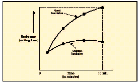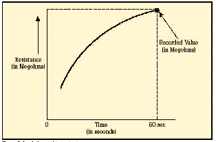 [page]在短時測試中,兆歐表被直接跨接在被測設備上,施加大約60秒的測試電壓。為了在大約一分鐘的時間內使絕緣值讀數達到穩(wěn)定,應該只對低容性的設備進行該項測試?;镜倪B接步驟和驗證測試時相同,所施加的電壓按DC測試電壓公式進行計算。當測試好的設備時,您會注意到,隨電容容量和吸收電流的降低,絕緣阻抗值會穩(wěn)定上升。由于溫度和濕度會影響測試結果,應該在標準溫度(大約20?C/68?F)下、露點之上的環(huán)境下進行測試。 當設備的額定值等于或小于1000伏特時,絕緣讀數應該為1MΩ或更高。當設備額定值高于1000伏特時,理想的阻抗應該為每1000伏特上升1MΩ。所測量的絕緣阻抗值通常會略低于以前記錄的值,其下降的趨勢規(guī)律如圖6所示。絕緣值下降的斜率是絕緣材料老化程度的正常信號。陡峭的下降斜率是絕緣失效或可能出現故障的先兆。