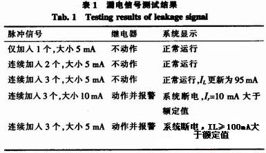 為了測(cè)試需要,我們?cè)O(shè)計(jì)了一個(gè)信號(hào)源,可以按照系統(tǒng)檢測(cè)信號(hào)的要求產(chǎn)生脈沖信號(hào),以脈沖信號(hào)來(lái)模擬漏電信號(hào)。設(shè)定緩變電流動(dòng)作值為100 mA,突變電流動(dòng)作值為8 mA,當(dāng)緩變電流累計(jì)值達(dá)到90 mA時(shí),測(cè)試結(jié)果如表1所示。
