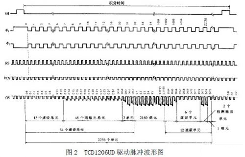 (1)工作原理。 TCD1206UD 在圖2 所示的驅(qū)動脈沖作用下工作。當ΦSH 脈沖的高電平到來時,正值Φ1 電極下均形成深勢阱,同時ΦSH 的高電平使Φ1 電極下的深勢阱與MOS 電容存儲勢阱溝通。