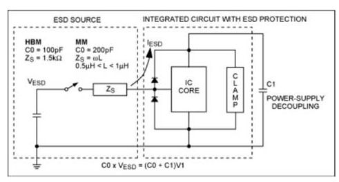 靜電放電強(qiáng)度以電壓形式表示,該電壓由電容的儲(chǔ)能電荷產(chǎn)生,最終傳遞到IC。作用到IC的電壓和電流強(qiáng)度與IC和ESD源之間的阻抗有關(guān)。對(duì)電荷來源進(jìn)行評(píng)估后建立了ESD測(cè)試模型。