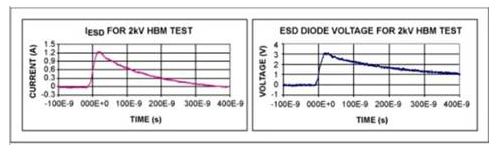 如果對(duì)IC引腳進(jìn)行 HBM測(cè)試,測(cè)試電路的初始電壓是2kV,通過ESD二極管的電流約為1.33A(圖2):