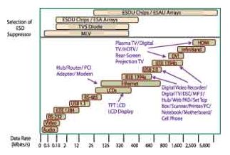 對(duì)于數(shù)據(jù)速率在350Mb/s或低于350Mb/s的應(yīng)用,瞬態(tài)抑制二極管和多層壓敏電阻是提供保護(hù)的極好選擇。這些應(yīng)用包括標(biāo)清LCD顯示器、TFT顯示器,以及大多數(shù)的計(jì)算機(jī)周邊接口及連接。這些信號(hào)天生就允許高的插入損耗、高鉗位電壓和觸發(fā)電壓。鑒于電源引腳上并沒有任何信號(hào),因此,高速抑制相應(yīng)并不是必需的。瞬態(tài)抑制二極管和多層壓敏電阻也可以有效地保護(hù)像USB 2.0以及其他更高速率的接口電源引腳。但是,對(duì)于像DVI、HDMI、USB 3.0以及最新的IEEE 1394 A和B標(biāo)準(zhǔn)下的數(shù)據(jù)通信線路,實(shí)現(xiàn)最小信號(hào)失真的高速抑制響應(yīng)對(duì)于系統(tǒng)性能和電路保護(hù)是至關(guān)重要的。這些應(yīng)用包括數(shù)字視頻設(shè)備、MP3播放器、手機(jī)、 PDA、網(wǎng)絡(luò)交換器、有線和衛(wèi)星電視機(jī)頂盒、打印機(jī)、掃描儀、復(fù)印機(jī)以及筆記本電腦和上網(wǎng)本等計(jì)算機(jī)設(shè)備。