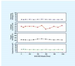 多年以來,在多種電器設(shè)備中廣泛應(yīng)用多層壓敏電阻來提供有效的靜電放電抑制。多層壓敏電阻相對(duì)較低的擊穿電壓和觸發(fā)電壓以及能經(jīng)受多次脈沖的能力是相當(dāng)令人滿意的??墒牵鄬訅好綦娮杈哂休^高的漏電流和電容,并且降低電容帶來的有害影響導(dǎo)致其無法勝任高速數(shù)據(jù)的應(yīng)用。[page]