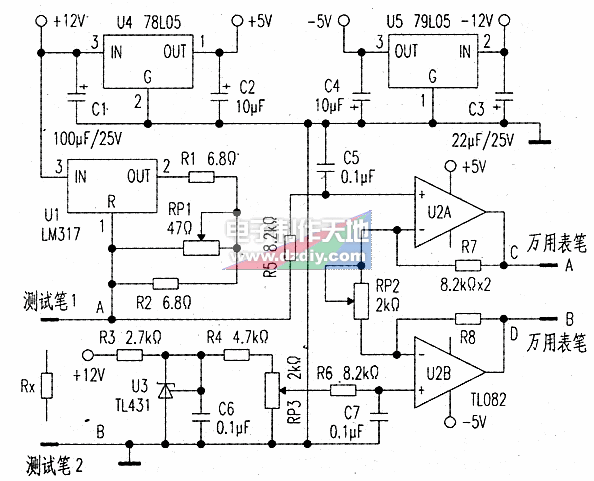 由運(yùn)算放大器U2A和U2B及R7、R8、RP2(精密電位器)構(gòu)成電壓放大電路,對(duì)被測(cè)電阻兩端的電壓進(jìn)行10倍放大,這樣數(shù)字萬用表從C、D兩點(diǎn)測(cè)得的電壓值就可以與被測(cè)電阻RX的阻值相對(duì)應(yīng)(1mV對(duì)應(yīng)1mΩ,1V對(duì)應(yīng)1Ω)。