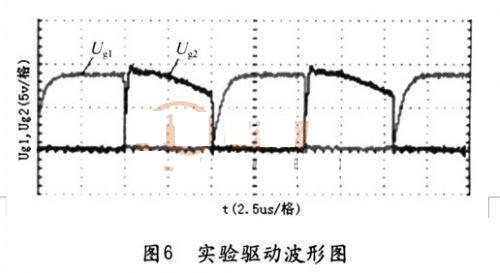 本文設(shè)計(jì)了一臺(tái)不對(duì)稱半橋變換器樣機(jī):工作頻率為98kHz,輸人電壓為400VDC,輸出電壓為30VDC。測(cè)得占空比為0.47時(shí)的驅(qū)動(dòng)波形Ug1,Ug1如圖(6)所示。