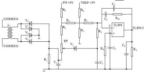 本開(kāi)關(guān)電源過(guò)流保護(hù)電路的工作原理見(jiàn)圖4。變壓器T 1原邊串接在開(kāi)關(guān)電源主變壓器原邊回路中, 通過(guò)實(shí)驗(yàn)選擇合理的變壓器原副邊匝數(shù)比,感應(yīng)開(kāi)關(guān)電源變換時(shí)的原邊電流值, 經(jīng)二極管V1 ~ V4 整流, R1、C1 濾波后送電位器RP。原邊電流越大,電流取樣變壓器整流出的電壓越大, 電位器RP 中心點(diǎn)電壓越低,TL494: 2 腳電壓隨之下降, 使得TL494: 3 腳電壓升高,送入脈寬調(diào)制器, 將T L494 驅(qū)動(dòng)脈沖寬度逐漸減少, 從而得到過(guò)流保護(hù)的目的。圖中電容C4、C5、R10為TL494 誤差放大器的反饋元件, 使得放大電路穩(wěn)定可靠。