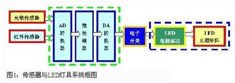 傳感器作為信號采集和機電轉(zhuǎn)換的器件,其機電技術都已相當成熟,近幾年MEMS技術興起又將傳感器技術向小型化、智能化、多功能化、低成本化大踏步邁進。光敏傳感器、紅外傳感器等各種類型的傳感器都可與LED照明燈具組成一個智能控制系統(tǒng),傳感器將采集來的各種物理量信號轉(zhuǎn)換成電信號,可以經(jīng)由集成電路化的AD轉(zhuǎn)換器、MCU、DA轉(zhuǎn)換器對所采集的信號進行智能化處理,從而控制LED照明燈具開啟和關閉。人類可以籍此在MCU上設定各種控制要求,控制LED燈的開關時間、亮度、顯色、多彩變幻,從而達到省電節(jié)能的目標。傳感器與LED燈具組成的系統(tǒng)框圖如圖1所示。目前的集成電路制造技術已經(jīng)可以將AD、DA、MCU集成在一個5X5mm或更小的封裝內(nèi),安裝在燈具內(nèi)既不占面積而且十分方便。