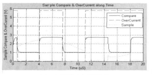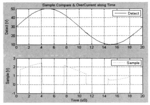 設(shè)檢測(cè)端電壓一般在10~50 V 之間變化,我們?cè)O(shè)置V(Detect)=SIN(30,20,50 k);周期為20μS;又設(shè)在采樣周期內(nèi),比較電壓為1 V;依據(jù)LDMOS管導(dǎo)通特性,設(shè)輸出漏電壓高于某值(本例為20伏)為過(guò)流,則分壓比設(shè)計(jì)為K = R4/ ( R3+R4)=5 k/(5 k+95 k)=1/20, 于是得到采樣電壓值為V(Sample)=V(Detect)*k =SIN(1.5,1,50 k),即最大值為2.5,最小值為0.5。同樣地,我們?cè)诓蓸与娐份敵龆思由弦粋€(gè)電容以消除電壓尖峰影響。該采樣電路仿真結(jié)果如圖6 所示。