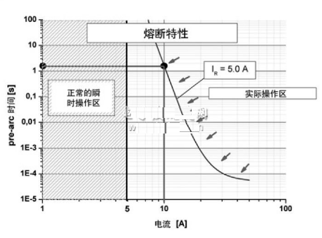 圖1所示的熔融特性有兩個主要區(qū)域。在箭頭所指曲線左邊的第一個區(qū)域,包括在陰影區(qū)的正常“瞬時”操作區(qū)域,以及在短時過流達到保險絲額定電流兩倍時的情況。這個區(qū)域定義了貼片式保險絲承受脈沖負載的能力,該能力取決于熔體的特性,如增大熔體的交叉區(qū)域就可實現(xiàn)高脈沖負載。