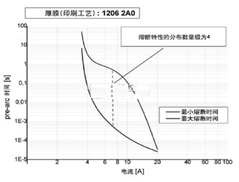 在設計階段,電子工程師會碰到熔斷特性大幅變化的情況。一般來說,貼片式保險絲是低阻值的電阻,其阻值只有幾歐姆。如上所述,熔融特性與電阻值有關。如果電阻值的變化范圍很大,熔融特性也就相應地有很大變化。由于這種可能發(fā)生的變化,貼片式保險絲在碰到正常的涌流時就斷開,或是相反,在過載情況下,應該斷開時卻不斷開,這種最糟糕的情形是工程師必須避免的。圖3所示為印刷厚膜保險絲的熔斷特性典型分布。