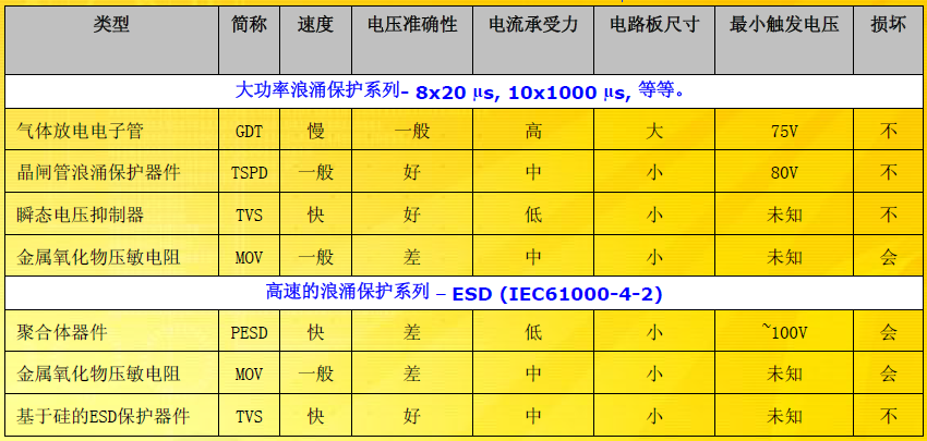 市場上有一系列對電子系統(tǒng)起保護作用的產(chǎn)品。下表簡單描述了各種產(chǎn)品的特征。
