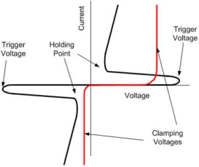 圖示:雙向消弧保護器件(黑色)和單向鉗位保護器件(紅色)的I-V曲線