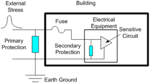 初級和次級保護的應(yīng)用非常普遍。這個概念在電信產(chǎn)業(yè)中用于閃電和浪涌保護,也在先進集成電路技術(shù)中做靜電放電(ESD)保護。初級的保護元件較貼近應(yīng)力源,主要目的是用于承受大部分的電流應(yīng)力,而次級保護元件則非常貼近敏感的電路元件,在最需要的地方提供保護。
