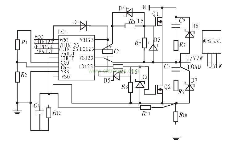 圖2中HIN1~HIN3、LIN1~LIN3:逆變器上橋臂和下橋臂功率管的驅(qū)動信號輸入端,低電平有效。CA-、CAO、VSO:內(nèi)部放大器的反相端、輸出端和同相端,可對主電路的電流進行檢測。ITRIP:過流信號檢測輸入端,可通過輸入電流信號來完成過流或直通保護。FAULT:過流、直通短路、過壓、欠壓保護輸出端,該端提供一個故障保護的指示信號。它在芯片內(nèi)部是漏極開路輸出端,低電平有效。VB1~VB3:是懸浮電源連接端,通過自舉電容和快速恢復(fù)二極管為3個上橋臂功率管的驅(qū)動器提供內(nèi)部懸浮電源,其中快速恢復(fù)二極管的作用是防止母線電壓倒流損壞器件,VS1~VS3是其對應(yīng)的懸浮電源地端。HO1~HO3、LO1~LO3:逆變器上下橋臂功率開關(guān)器件驅(qū)動器信號輸出端?! ?br />