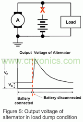 當(dāng)引擎開始工作,電池從電源線上斷開,發(fā)電機(jī)繼續(xù)為汽車的電源線輸出電流,這是產(chǎn)生浪涌電壓的最糟糕的情況。這種情況就是所說的“甩負(fù)荷”,大多數(shù)汽車制造商和行業(yè)協(xié)會(huì)都會(huì)針對(duì)這種甩負(fù)荷狀態(tài),制定最高電壓、線路阻抗,和這種甩負(fù)荷狀態(tài)的持續(xù)時(shí)間,如圖5所示。甩負(fù)荷的源阻抗高于正常條件下瞬態(tài)測(cè)試時(shí)的阻抗,因?yàn)殡姵匾呀?jīng)斷開,只有發(fā)電機(jī)在向外輸出電能,這時(shí)發(fā)電機(jī)的內(nèi)部線圈的作用就象一個(gè)限流電阻。