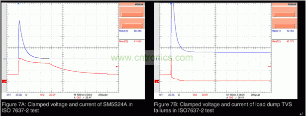圖7A:在ISO 7637-2測(cè)試中SM5S24A的鉗位電壓和電流 圖7B:在ISO7637-2測(cè)試中甩負(fù)荷TVS失效情況下的鉗位電壓和電流