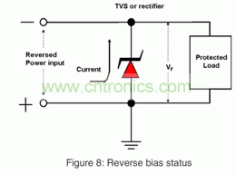 MOSFET的柵極在-1V或更低的反向電壓下也很脆弱。在反向電源輸入模式中,電源線的電壓域TVS VF的電壓相同。這種反向偏置模式會(huì)引起電子線路的故障。EPI PAR TVS的低正向壓降能夠很好地解決這個(gè)問題。保護(hù)電路免受反向電源輸入損害的另一個(gè)方法是在電源線中放一個(gè)極性保護(hù)整流器,如圖8所示。極性保護(hù)整流器應(yīng)該有足夠的正向電流等級(jí),以及正向浪涌和反向電壓性能。