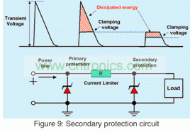 汽車系統(tǒng)中保護(hù)電路的首要目標(biāo)是高浪涌電壓,但是被鉗位的電壓仍然很高。因此在24V動(dòng)力總成中二次保護(hù)特別重要,比如卡車和小貨車?yán)锏膭?dòng)力總成。主要原因是大多數(shù)穩(wěn)壓器和DC-DC轉(zhuǎn)換器IC的輸入電壓是45V~60V。對(duì)于此類應(yīng)用,建議使用使用圖9中的二次保護(hù)。