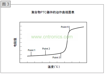 在圖3的Point 1時溫度較低,產(chǎn)生的熱量和散發(fā)的熱量達到平衡,但是當流過的電流較多或是環(huán)境溫度較高時,會產(chǎn)生較高的熱量,而提高PolySwitch器件的溫度,然而當電流或環(huán)境溫度的增加并不顯著,PolySwitch器件所產(chǎn)生的熱量可以散發(fā)至環(huán)境中而