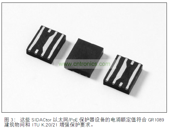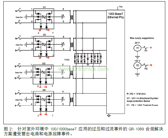 數(shù)據(jù)對導線中的保險絲提供必要的過流保護,對一級 GR-1089 事件的雷擊引起的過壓電涌不敏感。 雙向半導體晶閘管電涌保護設備 IC1 至 IC4 或 SIDACtor設備(參見圖3.)提供過壓消弧保護方法,根據(jù) GR-1089 第 6 版,這種方法符合一級和二級雷擊電涌。