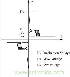 6)電流—電壓特性曲線以美國(guó)克來(lái)電子公司CG2-230L氣體放電管為例,如圖2所示。