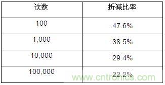 >> 預測100億次(2萬小時+)和1000億次(20萬小時+)的脈沖折減比率期望值分別為:2.6%和2%。但是基于現(xiàn)有數(shù)據(jù)預測是有誤差的,從統(tǒng)計學的角度,有95%的把握分別落在(1.3%, 3.8%)(1%, 3.1%)范圍內。在實際計算中,我們都取下限作為計算標準。