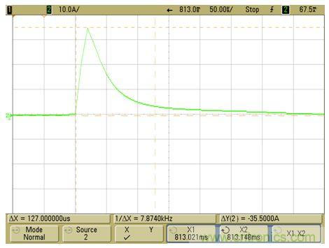 以下為實際應用時量測到電源正常工作時的波形:電流尖峰 max 3.6A,寬度約為1.2ms;正常電流約為0.03A,正常工作時溫度可以達到85℃。