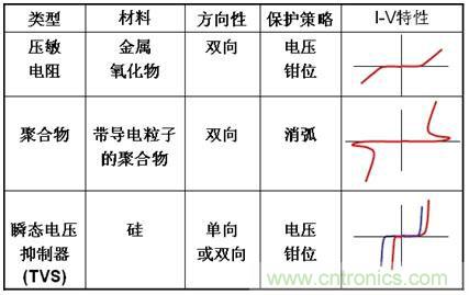 安森美半導(dǎo)體來自美國的ESD保護(hù)專家Robert Ashton博士說,一般而言,ESD保護(hù)元件的分類可以通過其保護(hù)策略與方向性來進(jìn)行,主要包括壓敏電阻、聚合物和瞬態(tài)電壓抑 制器(TVS)等,如表1所示。在這幾種保護(hù)元件中,壓敏電阻在低電壓時,呈現(xiàn)出高電阻,其中的每個小型二極管兩端的電壓都相當(dāng)?shù)?,同時電流也相當(dāng)?。欢谳^高電壓時,其中的獨(dú)立二極管開始導(dǎo)通,同時壓敏電阻的電阻會下降。從表1中我們也可以看出壓敏電阻為雙向保護(hù)元件。而對于帶導(dǎo)電粒子的聚合物而言,在正常電壓下,這些材料擁有相當(dāng)高的電阻,但當(dāng)發(fā)生ESD沖擊時,導(dǎo)電粒子間的小間隙會成為突波音隙陣列,從而帶來低電阻路徑。