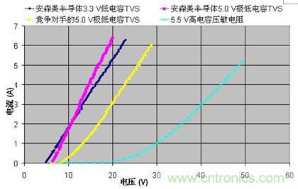 圖3的屏幕截圖就是這樣一個范例。從圖中可以看出,安森美半導(dǎo)體的TVS元件可以迅速將ESD應(yīng)力降低,即從8 kV靜電電壓鉗位到5至6 V的水平;但壓敏電阻的曲線則下降得很慢,而且無法降到很低的水平。該曲線表明,TVS器件的恢復(fù)時間非常短,經(jīng)過TVS器件泄漏到后面電路的能量也非常少,特別適合于便攜式設(shè)備的應(yīng)用。