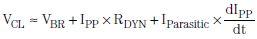 由于ESD是一種極速瞬態(tài)事件,I/O路線的電壓不能立即得到鉗制。如圖6所示,根據(jù)IEC 61000-4-2標(biāo)準(zhǔn),數(shù)千伏電壓被鉗制為數(shù)十伏。如方程式1所示,RDYN越小,鉗位性能也就越好:其中,IPP為ESD事件期間的峰值脈沖電流,而Iparasitic為通過(guò)TVS接地來(lái)自連接器的線路寄生電感。