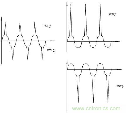 圖4中在開啟或關閉帶有感性, 容性的負載電路時, 直流波形出現(xiàn)開關尖脈沖, 壓敏電阻將吸收這種反電動勢, 有效地保護開關電路、變電壓。