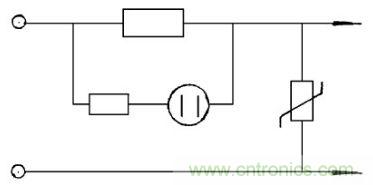 當使用電壓超過壓敏電阻標稱值電壓時, 在毫微秒的時間內, 壓敏電阻的阻值急劇下降, 流過壓敏電阻的電流急劇增加, 保險絲熔斷, 使照明燈具線路斷電而得到保護, 同時并聯(lián)在保險絲兩端的氖燈點亮,發(fā)出保險絲已熔斷的警告。