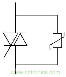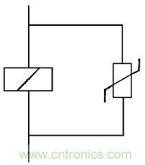 [page]圖8中壓敏電阻并在開關觸點回路或被控制帶有感抗、容抗的負載, 防止電弧火花放電保護開關觸點,延長使用壽命。
