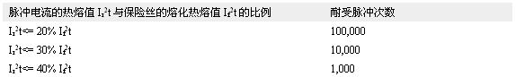 3. 計(jì)算脈沖電流I2t,參見(jiàn)表1 幾種常見(jiàn)脈沖電流的熱熔值的計(jì)算。復(fù)雜或非典型的波形可以用數(shù)字示波器的數(shù)據(jù)做積分計(jì)算;或者用簡(jiǎn)化計(jì)算法,用可以完全覆蓋脈沖波形的典型脈沖波形做近似計(jì)算。4. 脈沖折減,依據(jù)所需耐受脈沖次數(shù),從表2 查找脈沖折減系數(shù)。5. 如果脈沖發(fā)生時(shí)環(huán)境溫度會(huì)大于室溫,需要做相應(yīng)的溫度折減。6. 確定可耐受脈沖次數(shù)的保險(xiǎn)絲最小的電流值。